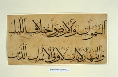 | Keywords: Muhaqqaq script - Qur'anic verses.jpg en Parts of verses 190-191 of the 3rd chapter of the Qur'an entitled Surat Al 'Imran The Family of 'Imran The text is executed in a crisp and fully vocalized muhaqqaq script on a light beige paper and may have been executed in Persia or Central Asia during the early 15th century LOC-calligraphy ascs 284 Unknown Calligrapher century 15 PD-Art Muhaqqaq style Qur'an manuscripts 15th century Library of Congress Arabic Persian and Ottoman calligraphy collection |