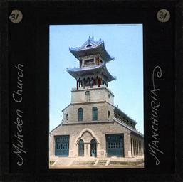 | Keywords: Mukden Church, Manchuria, ca. 1882-ca. 1936 (imp-cswc-GB-237-CSWC47-LS8-031).jpg en <br> Mukden Church Manchuria ca 1882-ca 1936 Exterior photograph of Mukden Church The church which is brick built is constructed to the traditional Chinese pagoda style of architecture There is a figure standing in the door way of the church Mukden or Shenyang is the capital of Liaoning province in Northeast China The Scottish missionary Dugald Christie came here in 1884 ; This belongs to a series of Church of Scotland Foreign Missions Committee lantern slides relating to the Scottish missionary Dugald Christie Dugald Christie was born in Glencoe in Scotland and studied medicine under the auspices of the Edinburgh Medical Missionary Society In 1882 along with his first wife Elizabeth he went to Manchuria to work as a medical missionary of the United Presbyterian Church of Scotland He worked initially in Newchang and later moved to the capital of Mukden where he opened Manchuriaas first hospital in 1884 In 1912 he established Mukden Medical College Dugald Christie retired in 1923 and died in Edinburgh in 1936 Photographer Unknown Subject personal name Christie Dugald 1855-1936 Filename imp-cswc-GB-237-CSWC47-LS8-031 tif Coverage date 1882/1936 Part of collection International Mission Photography Archive ca 1860-ca 1960 Geographic subject region Manchuria Type images Part of subcollection Photographs from the Centre for the Study of World Christianity University of Edinburgh U K ca 1900-ca 1940s Repository name Centre for the Study of World Christianity Archival file impaunpub_Volume7/1693 url Geographic subject city or populated place Mukden Repository address The University of Edinburgh School of Divinity New College Mound Place Edinburgh EH1 2LX United Kingdom Geographic subject country China Format aacr2 1 lantern slide 8 x 8 cm Geographic subject continent Asia Rights Contact the repository for details Part of series Dugald Christie LS8 Repository email divinity-CSWC ed ac uk Subject lcsh Keyword Church buildings Date created 1882/1936 Publisher of the digital version University of Southern California Libraries Subject aat genre exterior views Format aat lantern slides Legacy record ID impa-m69142 Access conditions http //www ed ac uk/schools-departments/divinity/research/centres/world-christianity/collections-resources File GB 237 CSWC47/LS8/31 1882/1936 author http //digitallibrary usc edu/cdm/ref/collection/p15799coll123/id/64812 PD-old-70-1923 Magic lantern images Images from USC Digital Library uploaded by Fæ International Mission Photography Archive ca 1860-ca 1960 Mukden |