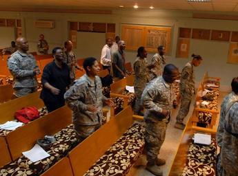 | Keywords: Multi-National Division - Baghdad Soldiers party all night to christen New Year DVIDS140292.jpg en Soldiers from the 1st Brigade Combat Team 4th Infantry Division Multi-National Division - Baghdad and civilians attend a New Years church service at the Steel Falcon Memorial Chapel Dec 31 2008 to practice their faith and celebrate the new year minutes before the beginning of 2009 at Forward Operating Base Falcon in southern Baghdad's Rashid District The 1st Raider Brigade Soldiers attended many New Year's events at FOB Falcon to celebrate the holiday 2008-12-31 Sgt 1st Class Brent Williams https //www dvidshub net/image/140292 140292 2009-01-01 13 41 BAGHDAD IQ PD-USGov Forward Operating Base Falcon Images from DoD uploaded by Fæ |