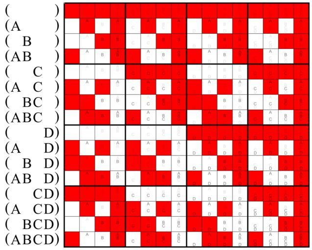 Keywords: Multigrade operator XNOR.svg Logical biconditional of the arguments in the parentheses to the left of the matrix Red squares stand for binary ones respectively for true 135 of 256 squares are red own 2010 Mate2code Related files User Boolean Algebra/Multigrade operator examples <br clear all> Truth tables Binary square matrices in logic Walsh matrix of order 16