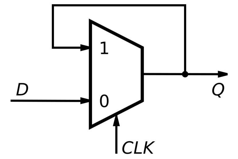 Keywords: Multiplexer-based latch (negative).svg en A negative latch i e transparent when CLK 0 constructed using a multiplexer <math>Q \overline CLK \cdot Q + CLK \cdot D</math> own Inductiveload 2009-11-12 Flip-flops