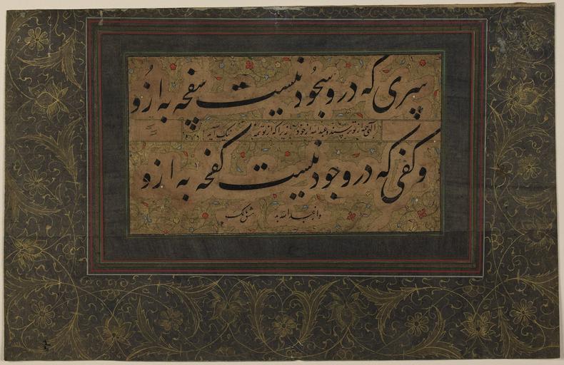 | Keywords: "Munajat" of 'Abdallah Ansari WDL159.png Artwork ru алик Дайлами fr Malik Daylami en Malik Daylami zh 马里克(多乐美) pt Malik Daylami ar مالك ديلمي es Malik Daylami ru унаджат Абдаллаха Анса и fr Les Munajat d'Abdallah Ansari en Munajat of 'Abdallah Ansari zh 阿布 拉·安沙里的 pt Munajat de 'Abdallah Ansari ar مناجاة لعبد الله أنصاري ru Этот ф агмент каллиг афии включает из ечение из <i> унаджата</i> олитв великого пе сидского мистика и ученого Хаджи Абдаллаха Анса и уме в 1088 г В этих двух ст оках описываются плоды молитвы и щед ости Ст оки текста выполнены че ным <i>ш ифтом насталик </i>на бежевой бумаге в об амлении изящных облакооб азных полос на позолоченном фоне Полоса текста об амлена множеством азнооб азных к омок и наклеена на лист пу пу ной бумаги ук ашенной золотыми пе еплетениями с цветочными мотивами ежду двумя основными ст оками текста и под ними п иведена надпись следующего соде жания Боже все боятся Тебя но Абдаллах боится себя ибо все доб ое исходит от Тебя а все злое от Абдаллаха т е слуги Божьего В этом к атком п едложении авто восхваляет Божью щед ость и благость С азу после восхваления Богу стоит подпись каллиг афа машк-и алик сочинение алика Именем алик очевидно называл себя каллиг аф алик Дайлами служивший п авителю династии Сафавидов шаху Тахмаспу кото ый п авил с 1524 по 1576 год <br>А абская каллиг афия; Иллюмини ование укописей; Исламская каллиг афия; Исламские укописи; Письмо насталик fr Ce fragment de calligraphie comprend une maxime tirée des <em>Munajat</em> Supplications du grand savant et mystique persan Khawadja Abdallah Ansari mort en 1088 Les deux lignes décrivent les bienfaits de la prière et de la générosité Elles sont rédigées en noir<em> </em>en écriture nastaliq sur papier beige et encadrées par des bandes nuageuses délicates sur un fond d'or lumineux Le panneau du texte est encadré par diverses bordures et collé sur une feuille de papier violet décorée de motifs de fleurs entrelacées dorées Entre et sous les deux principales lignes du texte on peut lire l'inscription suivante « Dieu tout le monde Te craint mais Abdallah se craint lui-même parce que tout ce qui est bon vient de Toi et tout ce qui est mauvais vient d'Abdallah « le serviteur de Dieu » » Cette petite phrase loue la munificence et la bonté de Dieu Immédiatement après cette louange se trouve la signature du calligraphe mashq i-Malik composition de Malik Malik pourrait être le calligraphe Malik Daylami qui fut au service du souverain safavide Shah Tahmasp au pouvoir de 1524 à 1576 <br>Calligraphie arabe; Enluminures; Calligraphie islamique; Manuscrits islamiques; Écriture nastaliq en This calligraphic fragment includes a maxim drawn from the <em>Munajat</em> Supplications of the great Persian mystic and scholar Khwajah 'Abdallah Ansari died 1088 The two lines describe the benefits of prayer and generosity The two lines of text are executed in black <em>nasta'liq </em>script on beige paper and framed by delicate cloud bands on a gold illuminated background The text panel is framed by a variety of borders and pasted to a sheet of purple paper decorated with gold interlacing flower motifs Between and below the two main lines of text appears an inscription reading God everyone fears You but 'Abdallah fears himself because everything that is good comes from You and everything that is evil comes from 'Abdallah i e 'the servant of God' This diminutive sentence serves as the author's praise of God's munificence and kindness Immediately after the praise of God appears the calligrapher's signature mashq-i Malik 'composition of Malik' Malik may be identified as the calligrapher Malik Daylami who was in the service of the Safavid ruler Shah Tahmasp who reigned from 1524 to 1576 <br>Arabic calligraphy; Illuminations; Islamic calligraphy; Islamic manuscripts; Nasta'liq script zh 这书写的片段包括摘自伟大的波斯神秘主义学 赫瓦 赫·阿 拉·安萨里(1088 年 世) 品 <i> Munajat </i> (祈祷)的 句格 两行文字描述了祈祷与慷慨的益处 两行文字为黑色 <i>波斯体 </i>手迹,纸张为褐色纸张,裱框为金色反光背景上的精致云彩状图案 文字镶 的裱框为各种不同的边纹,并贴 金色交错花 图案装饰的紫色纸张上 两行文字之间以及下方的文字内容为: 上 ,每个人都害 你,但阿 拉却害 他自己,因为 切美好的食物都是为你 赐, 切邪恶的食物却 自阿 拉(上 的仆人) 这 短词语是 对上 的慷慨与善良的赞美 对上 的赞美词之后是书法家的签名: mashq-i Malik (马利克 ) 马利克也可称之为书法家马利克·多乐美, 务于萨 王 统治 瑟尔汗·太美斯普(执政于 1524-1576 年间 ) <br>阿拉伯文书法; 插图; 伊斯兰书法; 伊斯兰手稿; 波斯体书法 pt Este fragmento da caligrafia inclui uma máxima extraída do <i>Munajat</i> Súplicas do grande místico e erudito Persa Khwajah 'Abdallah Ansari morreu 1088 As duas linhas descrevem os benefícios da oração e da generosidad