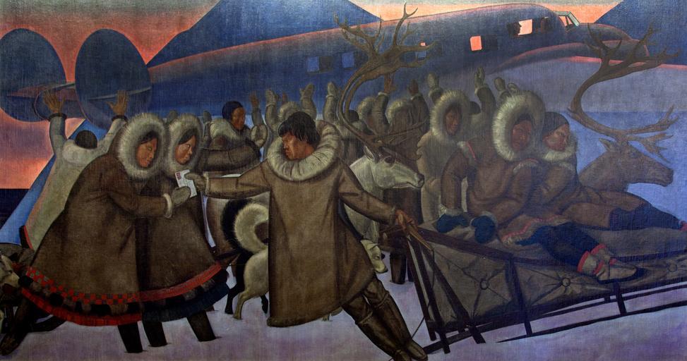 Keywords: Mural-Ariel-Rios-Rockwell-Kent-2.jpg Rockwell Kent at the Ariel Rios Federal Building Washington D C Date 1937; dimensions 7' x 13' 6 Photographed as part of an assignment for the General Services Administration Title date and keywords from information provided by the photographer Credit line Photographs in the Carol M Highsmith Archive Library of Congress Prints and Photographs Division Gift; Carol M Highsmith; 2009; DLC/PP-2009 083 Forms part of Photographs in the Carol M Highsmith Archive Mural information from the http //m gsa gov/m/vpb/01028/art_10 html General Services Administration <br> In the 1930s mail still arrived in Alaska's ports by ship from Seattle From there airplanes commonly transported letters and goods within the state At each stop bags were transferred to dog sleds for delivery to their final destinations Native Alaskans who were far more familiar with the land and its navigation than recent immigrants were often hired to drive the dog sleds This represented a great economic opportunity for a group of people otherwise facing fierce discrimination In Mail Service in the Arctic a group of native Alaskans bids farewell to the mail plane In the foreground an envelope addressed to Rockwell Kent at Au Sable Forks New York changes hands between two women dressed in traditional fur-lined parkas and the driver of the sled LOC-image highsm 24935 Creator Carol M Highsmith 2011-09 PD-Highsmith Ariel Rios Federal Building mural photographs by Carol M Highsmith Rockwell Kent Fur fashion in 1937
