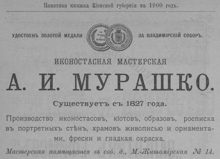 | Keywords: Murashko Oleksandr Ivanovych, advertising studio, 1900.jpg en Murashko Oleksandr Ivanovych advertise iconostasis workshop 1900 uk Реклама іконостасної майсте ні у ашка Олександ а Івановича 1900 ік 2013-07-12 22 06 32 http //oldbooks ax3 net/BookLibrary/16001-Pam -knizhki-Kievskoy-gub/1899 -Pamyatnaya-knizhka-Kievskoy-gubernii-na-1900-god -18-y-god html Памятная книжка Киевской губе нии на 1900 год Київський Губе нський статистичний комітет Custom license marker 2013 07 12 PD-old Uploaded with UploadWizard Oleksandr Murashko |