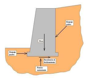 Keywords: Muro de contención.JPG Croquis de las principales fuerzas actuando sobre un muro de contención Own 2007-12 Alfredobi Dominio público Retaining wall diagrams