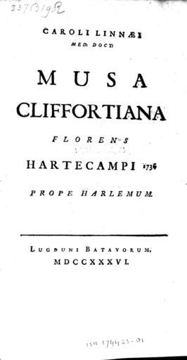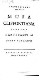 Keywords: Musa Cliffortiana 1736.jpg Titelblatt von Carl von Linnés Musa Cliffortiana 1 Auflage 1736 http //caliban mpiz-koeln mpg de/~stueber/linne/musa/high/IMG_1607 html www BioLib de 1736 Carl von Linné PD-old-100 Musa × paradisiaca
