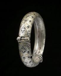 | Keywords: Musa Dabwani - Bracelet - Walters 572320 - View B.jpg The chased bracelet is made of a larger 2/3 and a smaller piece 1/3 that together form a hollow ring The decoration is that of a rhombic pattern with a cross-shaped design inside of the rhombi of the central row The other rhombi are either gilded or filled with green enamel On the inner side of the bracelet is an Arabic stamp with the name of the ruler al-Mahdi The similarity to stamps of al-Mahdi al- Abbas makes it likely that the pendants were produced under his reign from AH 1161 to 1189 AD 1748-1775 An engraved Hebrew inscription names the silversmith Musa Dabwani 1161-1189 AH/AD 1748-1775 silver with gilding green enamel Outer diam cm 6 9 ; Inner diam 1 15/16 x W 9/16 in 5 x 1 4 cm accession number 57 2320 80924 Mr Benjamin Zucker Zucker Family Trust and Mr Derek Content New York and London by purchase Walters Art Museum Joint gift to the Walters Art Museum Baltimore and the Israel Museum Jerusalem by Mr Benjamin Zucker and Mr Derek Content in honor of Mrs Barbara Zucker and Mrs Amanda Content 2010 Stamp Arabic al-Mahdi Engraving Hebrew Musa Dabwani place of origin northern Yemen Walters Art Museum license Jewellery in the Walters Art Museum South Arabian art in the Walters Art Museum Musa Dabwani Media contributed by the Walters Art Museum needs category review |