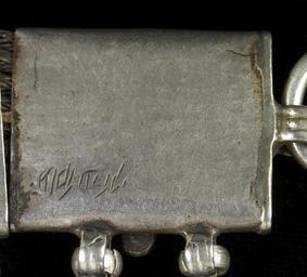 | Keywords: Musa - Girdle - Walters 572325 - Mark B.jpg The girdle is made of a flexible interlace mesh and has eleven movable retainers with large rhombic attachments each with two tear-shaped pendants and twelve retainers with smaller rhombic attachments each with one pendant All attachments were cast Small rings and rosettes frame the large rhombic elements and three-ring motif with burling rosettes accompany the smaller ones at their top and bottom The clasps are also decorated with a large rhombic elements A wire shaped in a figure-eight with a rosette is used as a closing element On the front of the clasps is an Arabic stamp with the name of the ruler and a date al-Mahdi 1170 The similarity to stamps of al-Mahdi al- Abbas makes it likely that the pendants were produced under his reign from AH 1161 to 1189 AD 1748-1775 An engraved inscription on the back of the clasp names the silversmith Musa Iraqi For another object by Musa Iraqi see Walters 57 2321 1170 AH/AD 1756-1757 silver with gilding L 34 x W 1 in 86 3 x 2 6 cm accession number 57 2325 80929 Mr Benjamin Zucker Zucker Family Trust and Mr Derek Content New York and London by purchase Walters Art Museum Joint gift to the Walters Art Museum Baltimore and the Israel Museum Jerusalem by Mr Benjamin Zucker and Mr Derek Content in honor of Mrs Barbara Zucker and Mrs Amanda Content 2010 Stamp Arabic al-Mahdi 1170 Engraving Hebrew Musa Iraqi place of origin Yemen Walters Art Museum license Jewellery in the Walters Art Museum South Arabian art in the Walters Art Museum Musa Iraqi Media contributed by the Walters Art Museum needs category review |