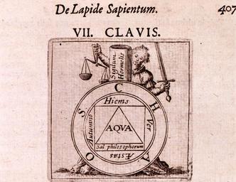 Keywords: Musaeum Hermeticum 1678 VII Clavis AQ35 Key 7.tif Matthaeus Merian 1593 “1650 From Tripus aureus hoc est Tres tractatus chymici selectissimi nempe I Basilii Valentini benedictini ordinis monachi Germani practica una cum 12 clavibus et appendice ex germanico; II Thomae Nortoni angli philosophi crede mihi seu ordinale ante annos 140 ab authore seriptum nunc ex anglicano manuscripto in latinum translatum phrasi eujusque authoris ut et sententia retenta; III Cremeri cuiusdam abbatis westmonasteriensis angli testamentum hactenus nondum publicatum nunc in diversarum nationum gratiam editi et figuris cupro affabre incisis ornati operâ et studio Michaelis Maieri phil et med d com p c Francofurti apud Hermannum à Sande MDCLXXVII as published in the collection Musaeum hermeticum reformatum et amplificatum Francofurti Apud Hermannum à Sande 1678 In Latin The part in question 'I Basilii Valentini benedictini ordinis monachi Germani practica una cum 12 clavibus et appendice ex germanico;' or 'Basil Valentine a German monk of the Benedictine order one study with the twelve keys and the appendix translated from the German ' A woman holds scales in her right hand and a sword in her left and stands behind a large flask the neck of which reads Sigilum Hermelis the Seal of Hermes The vessel is labelled CHAOS Within it is a circle labelled with the four seasons Hiems Ver Æstas Autumno around a square marked Sal philosophorum Salt of the Philosophers inside of which a triangle is inscribed with AQVA water http //othmerlib chemheritage org/record b1035996~S6 Catalog Information From the copy in the Roy G Neville Historical Chemical Library http //www chemheritage org/ Chemical Heritage Foundation Downloaded with permission from the Chemical Heritage Foundation as part of the Wikipedian in Residence initiative Chemical Heritage Foundation http //www chemheritage org/ Chemical Heritage Foundation 1678 PD-old-100 PD-old-100 cc-by-3 0 Chemical Heritage Foundation Category Alchemy Musaeum Hermeticum Archives Images from the Chemical Heritage Foundation Twelve Keys of Basil Valentine PD-old-100