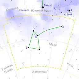 | Keywords: Musca constellation map ru lite.png en Musca constellation map on Russian ru Ка та созвездия ухи на усском языке It was created using the program PP3 At http //pp3 sourceforge net PP3's homepage you also get the input scripts necessary for re-compiling the map The yellow dashed lines are constellation boundaries the red dashed line is the ecliptic and the shades of blue show Milky Way areas of different brightness The map contains all Messier objects except for colliding ones The underlying database contains all stars brighter than 6 5 All coordinates refer to equinox 2000 0 The map is calculated with the equidistant azimuthal projection the zenith being in the center of the image The north pole is to the top The horizontal lines of equal declination are drawn for 0° +10° +20° etc The lines of equal rectascension are drawn for all 24 hours Towards the rim there is a very slight magnification and distortion Own 2006-10-16 Denis Ibaev Constellations_maps_russian |