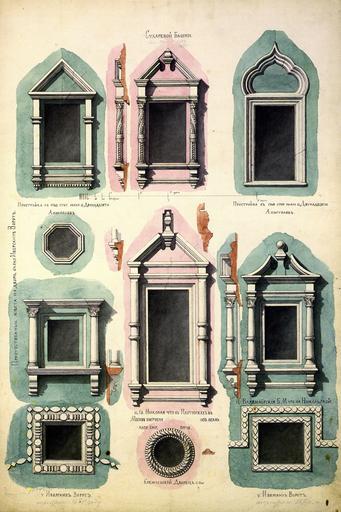 Keywords: Muscovite Window and Portals 17th century 01.jpg Windows of the 17th century Moscow churches Ink and watercolour sheets from the Moscow Archaeological Society files now in the Museum of Architecture collection Scan from И Л Бусева-Давыдова Культу а и искусство в эпоху пе емен - Инд ик 2008 ISBN 978-5-85759-439-1 Middle of the 19th century Unsigned; author to be verified; the project was led by en Mikhail Bykovsky ru Быковский ихаил До имедонтович 1801-1885 PD-RusEmpire Surveys of Moscow churches from the Museum of Architecture collection Windows in Moscow Church of the Theotokos of Vladimir on Nikolskaya Street ImageNote 1 635 70 655 1105 2000 3000 2 en Sukharev Tower ru Суха евская башня ImageNoteEnd 1 ImageNote 2 1300 65 670 1200 2000 3000 2 Northern annex of the en Church of the Twelve Apostles Севе ная п ист ойка к це кви Двенадцати Апостолов ImageNoteEnd 2 ImageNote 3 50 65 580 1105 2000 3000 2 Northern annex of the en Church of the Twelve Apostles Севе ная п ист ойка к це кви Двенадцати Апостолов ImageNoteEnd 3 ImageNote 4 760 2485 505 435 2000 3000 2 en Terem Palace Те емной Дво ец ImageNoteEnd 4 ImageNote 5 640 1165 620 1260 2000 3000 2 Church of Saint Nicholas in Plotniki en Arbat Street destroyed Це ковь св иколая в Плотниках на А бате; снесена ImageNoteEnd 5 ImageNote 6 1265 1275 705 1700 2000 3000 2 Church of the Theotokos of Vladimir near en Iberian Gates destroyed Це ковь Владими ской Богомате и у Иве ских во от ImageNoteEnd 6 ImageNote 7 45 1180 585 1750 2000 3000 2 Government building near en Iberian Gates П исутственные места у Иве ских Во от ImageNoteEnd 7 |