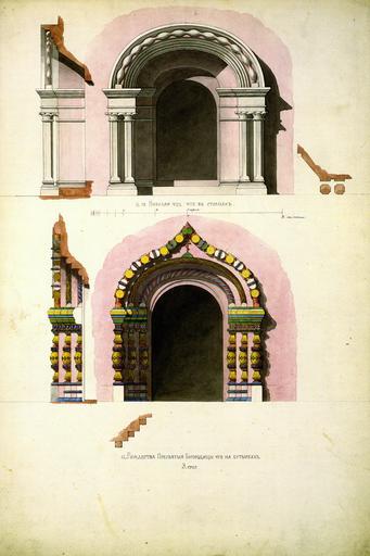 | Keywords: Muscovite Window and Portals 17th century 05.jpg  Portals of the 17th century Moscow churches Ink and watercolour sheets from the Moscow Archaeological Society files now in the Museum of Architecture collection Scan from И Л Бусева-Давыдова Культу а и искусство в эпоху пе емен -  Инд ик 2008 ISBN 978-5-85759-439-1 Middle of the 19th century Unsigned; author to be verified; the project was led by en Mikhail Bykovsky ru Быковский  ихаил До имедонтович 1801-1885 PD-RusEmpire Surveys of Moscow churches from the Museum of Architecture collection Portals in Russia ImageNote 1 110 25 1840 1100 2000 3000 2 Х ам святого  иколая Чудотво ца в Столпах А мянский пе еулок Church of Saint Nicholas in Stolpy destroyed stood in Armyansky Lane ImageNoteEnd 1 ImageNote 2 100 1150 1850 1460 2000 3000 2 Church of Nativity of Theotokos in Butyrky largely destroyed Х ам Рождества П есвятой Бого одицы в Буты ках ImageNoteEnd 2 |