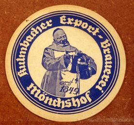 Keywords: Musée Européen de la Bière, Beer coaster pic-056.JPG Kulmbacher Export-Brauerei Mönchshof Photographed through glass own 2012-08-16 16 16 50 AlfvanBeem CC-zero Trademarked Musée Européen de la Bière Nostalgia by Alf van Beem Beermats