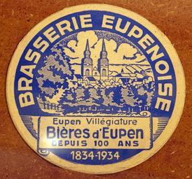 Keywords: Musée Européen de la Bière, Beer coaster pic-160.JPG Brasserie Eupenoise Photographed through glass own 2012-08-16 16 50 22 AlfvanBeem CC-zero Trademarked Musée Européen de la Bière Nostalgia by Alf van Beem Beermats