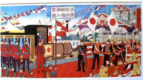| Keywords: Museum of Ethnology Vienna 012.JPG Erzherzog Franz Ferdinands Ankunft am Shinbashi-Bahnhof in Tokyo Signatur Kunimasa V Verleger Fukuda Kumajiro Druck August 1893 Farbholzschnitt Museum für Völkerkunde Wien Inv -Nr 115 995 3a-3c Franz Ferdinand legte die Strecke von Nagasaki bis Tokyo mit dem japanischen Torpedokreuzer Yayeshima mit Rikschas und zum Großteil auch mit der Eisenbahn zurück Am 17 August 1893 fuhr der Zug des Thronfolgers auf dem für die Öffentlichkeit gesperrten nur für Persönlichkeiten zugänglichen Shinbashi-Bahnhof in Tokyo ein Im Auftrag des japanischen Kaisers begrüßte dessen Onkel Prinz Arisugawa den Erzherzog Auch alle Minister und Hofwürdenträger waren zur Begrüßung erschienen eine Ehrenkompagnie intonierte einen Marsch Own 1893 Gryffindor pd-art Museum of Ethnology Vienna Archduke Franz Ferdinand of Austria Prince Arisugawa Taruhito Shiodome Freight Terminal 1893 works in Japan |