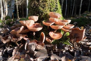 Keywords: mushroom disc fungus forest autumn nature forest floor forest mushroom brown many ground plant leaves log moss