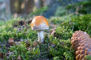 Keywords: mushroom hat orange orange brown flake white velum flakes autumn nature forest moss green grass forest floor pine cones