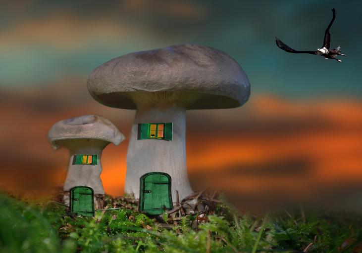 Keywords: mushroom home mushroom house fantasy photo montage composing forest lodge forest fairy tales nature cottage twilight adler bird door window