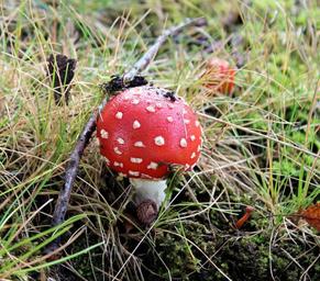 Keywords: mushroom red with white dots autumn agaric little grass forest