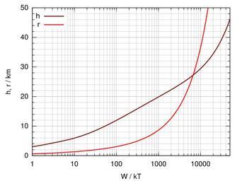 | Keywords: Mushroomcloud Size.svg en Final height h and radius r of a nuclear mushroom cloud as a function of the explosive yield W The final height is approximately the height above the burst point for low and intermediate W and approx the height above sea leval for high W Quelle Glasstone Dolan 1977 numerical approximation of original graph de Endhöhe und Radius der Pilzwolke einer Kernwaffenexplosion als Funktion der Sprengkraft W Die Endhöhe ist ungefähr die Höhe über dem Detonationspunkt für geringe und mittlere W und ungefähr die Höhe über Meeresniveau für große W Quelle Glasstone Dolan 1977 numerische Näherung des Originalgraphen Own SiriusB 2008-11-21 Image Mushroomcloud Size png The graph can be reproduced with Gnuplot version 4 2 or higher using this script reset lw1 2 0; lw2 2 0; lw3 1 ; lw4 0 5 set term svg enhanced size 600 450 font Helvetica 14 ;set output 'cloud svg' ch 3 0 scaling factor for height cw 0 6 scaling factor for radius f lx 0 006941 lx 4-0 06216 lx 3+0 1526 lx 2+0 1878 lx log height g lx 0 0137 lx 3-0 0358 lx 2+0 37 lx log radius h lx ch 10 f lx r lx cw 10 g lx h0 lx ch 10 lx/3 r0 lx cw 10 lx/3 clx 0 75;dlx 0 2 smooth interpolation via Fermi-Dirac function tau lx 1 / exp clx-lx /dlx +1 other interpolations are possible uat lx 1 -tau lx hsw lx tau lx h lx +uat lx h0 lx rsw lx tau lx r lx +uat lx r0 lx set logscale x; set logscale x2 set xrange 1 50000; set xtics 10; set mxtics 10 set yrange 0 50; set ytics 10; set mytics 5 set grid xtics ytics mxtics mytics back lt 1 lw 0 5 lc rgb ' 808080' lt 1 lw 0 5 lc rgb ' b0b0b0' set key left Use slanted fonts for variables if available set xlabel ' /Oblique W / kT'; set ylabel ' /Oblique h /Oblique r / km' set xlabel 'W / kT'; set ylabel 'h r / km' plot hsw log10 x t ' /Oblique h ' w l lt 1 lw lw1 lc rgb ' 770000' \ rsw log10 x t ' /Oblique r ' w l lt 2 lw lw1 lc rgb ' ff0000' reset Nuclear explosion physics Mushroom clouds SVG diagrams |