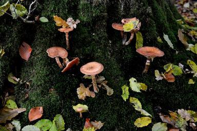 Keywords: mushrooms moss leaves forest forest floor tree stump