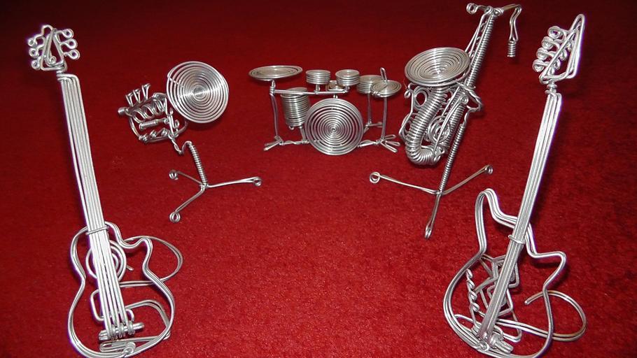 Keywords: music band instruments wire instruments art works of art creativity musical instruments models drums guitar trumpet bending wire figures saxophone bass instrument e bass exhibition red carpet craft work