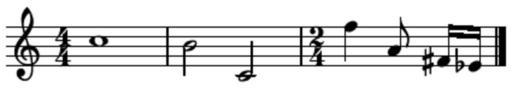 | Keywords: Music notation.png Music notation svg treble clef a time signature 4/4 a C whole note semibreve a bar line a B half note minim a C half note on a ledger line another bar line a time signature change to 2/4 an F quarter note crotchet an A eighth note quaver an F-sharp sixteenth note semiquaver beamed to an E-flat sixteenth note a double bar line clave de sol la indicación de compás 4/4 un do redonda una barra de compás un si blanca un do blanca en una línea adicional otra barra de compás un cambio de indicación de compás a 2/4 un fa negra un la corchea un fa sostenido semicorchea unido a un mi bemol semicorchea una doble barra de compás que indica fin de la partitura cambio de compás o de clave en wikipedia Created with GNU LilyPond and post-processed with GraphicConverter 2003-09-21 Dysprosia wikipedia en Later versions were uploaded by Bdesham at http //en wikipedia org en wikipedia bdesham LilyPond source <pre> \version 2 4 2 tune \relative c \clef treble \key c \major \override Staff TimeSignature 'style ' \time 4/4 c1 b2 c \time 2/4 f'4 a 8 fis16 ees \bar \score \new Staff \tune \layout raggedright t </pre> original upload log page en wikipedia Music_notation png 2004-11-27 18 15 Bdesham 425×73×4 1694 bytes <nowiki>better-looking version made with lilypond</nowiki> 2003-09-21 13 47 Dysprosia 485×324×8 9500 bytes <nowiki>Diagram of some musical symbols ed by myself w/ great thanks to Camembert</nowiki> ImageNote 1 106 42 8 8 425 73 2 whole note ImageNoteEnd 1 Sheet music examples |