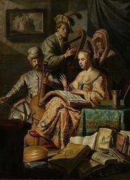 | Keywords: Musicerend gezelschap Rijksmuseum SK-A-4674.jpeg Artwork creator Rembrandt LangSwitch Allegorical music party To the left a man in oriental dress and a turban is playing the viol Right beside him a man plays the harp A young woman is sitting next to a table with an opened song book on her lap while singing Behind her an older woman with headscarf watches on Scattered on the floor are musical instruments a lute a violin and piles of books On the wall a painting showing Lot Fleeing Sodom can be seen Allegorisch musicerend gezelschap Links speelt een man is oosterse kleding en tulband op een viola da gamba Naast hem staat een jonge man met een harp Een jonge vrouw zit naast een tafeltje met een opengeslagen liedboek op schoot en zingt Achter haar kijkt een oude vrouw met een doek over het hoofd toe Op de voorgrond liggen muziekinstrumenten luit viool en stapels boeken Aan de muur een schilderij van de vlucht van Lot uit Sodom 1626 oil oak panel cm 63 5 48 Institution Rijksmuseum Amsterdam 2 8 Rh 1626 monogram and date bottom left ~ Object history by 1936 F Cripps England ProvenanceEvent 1936-11-16 sale Edward Speelman art dealer London Cripps Christie ™s London 155 Price guineas 2100 acquisition D Katz art dealer Dieren ProvenanceEvent 1940 acquisition Miedl-Goudstikker art dealer Amsterdam ProvenanceEvent 1940 acquisition Galerie Maria Almas-Dietrich art dealer Munich Linz 1042 ProvenanceEvent 1945 transfer LangSwitch das the au het Central Collection Point Munich 1405/1 restitution Nathan Katz 1893-1949 Basel ProvenanceEvent 1951-04-25 sale N K Nathan Katz Galerie Charpentier Paris N N Paris 59 acquisition Edward Speelman art dealer London ProvenanceEvent 1976 purchase LangSwitch das the le het Rijksmuseum Amsterdam Amsterdam Credit line LangSwitch Purchased by the Rijksmuseum Amsterdam with support of the Vereniging Rembrandt and the Aangekocht door het Rijksmuseum Amsterdam met steun van de Vereniging Rembrandt en de Stichting tot Bevordering van de Belangen van het Rijksmuseum www rijksmuseum nl http //www rijksmuseum nl Home http //www rijksmuseum nl/collectie/SK-A-4674 Info SK-A-4674 Other versions Rembrandt concert jpg Version from www rijksmuseum nl Rembrandt - The Music Party - WGA19249 jpg Version from www wga hu SK-A-4674 LangSwitch Musical Company Musicerend gezelschap cm 63 5 48 2938 Musicerend gezelschap Size cm 63 4 47 6 li001048 Musizierende Gesellschaft Size cm 63 48 allegorisch-musicerend-gezelschap 100005901 Allegorisch musicerend gezelschap Size cm 63 5 48 http //www wga hu/html/r/rembrand/41misc/01misc html The Music Party Size cm 64 48 Exhibition history Herwonnen Kunstbezit The Hague 45 The Mystery of the young Rembrandt Kassel and Amsterdam 22 Rembrandts moeder mythe en werkelijkheid 1 image Rembrandt The quest for chiaroscuro In het voetspoor van Rembrandt place of creation Amsterdam PD-US PD-old-100 Data and photography rights All data and all images made available through the API are either in the public domain or are subject to a CC0 license https //www rijksmuseum nl/en/api/terms-and-conditions-of-use cc-zero Uploaded with GWToolset Musicerend gezelschap Rijksmuseum SK-A-4674 http //www rijksmuseum nl/media/assets/SK-A-4674 Images uploaded by Fæ Images from the Rijksmuseum Musical Company Rembrandt |
