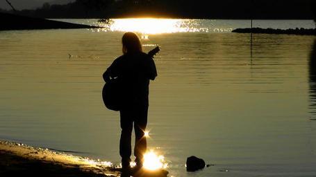 Keywords: musician guitarist musical silhouette twilight guitar instrument music evening sunset riverside abendstimmung atmosphere rhine romance romantic