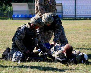 | Keywords: outdoor sport team sport YAVORIV, Ukraine - Soldiers of 1st Battalion, 93rd Mechanized Brigade put a hypothermia blanket on a casualty to lower the wounded Soldiers body temperature during combat lifesaver exercise, August 5, 2016. Soldiers of 6th Squadron, 8th Cavalry Regiment, 2nd Infantry Brigade Combat Team, 3rd InfantryDivision conducted the exercise to show Ukrainian Soldiers how to treat wounded Soldiers in combat. Soldiers of 6-8 Cav are here in support of the Joint Multinational Training Group-Ukraine. JMTG-U is responsible for training Ukrainian land forces and building a team of Ukrainian cadre who will ultimately assume that responsibility. The training is designed to reinforce defensive skills of the Ukrainian Ground Forces in order to increase their capacity for self-defense (U.S.Army photo by Spc. John Onuoha / Released) YAVORIV, Ukraine - Soldiers of 1st Battalion, 93rd Mechanized Brigade put a hypothermia blanket on a casualty to lower the wounded Soldiers body temperature during combat lifesaver exercise, August 5, 2016. Soldiers of 6th Squadron, 8th Cavalry Regiment, 2nd Infantry Brigade Combat Team, 3rd InfantryDivision conducted the exercise to show Ukrainian Soldiers how to treat wounded Soldiers in combat. Soldiers of 6-8 Cav are here in support of the Joint Multinational Training Group-Ukraine. JMTG-U is responsible for training Ukrainian land forces and building a team of Ukrainian cadre who will ultimately assume that responsibility. The training is designed to reinforce defensive skills of the Ukrainian Ground Forces in order to increase their capacity for self-defense (U.S.Army photo by Spc. John Onuoha / Released) |