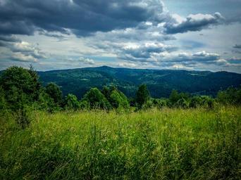 Keywords: muszyna mountains holiday meadow summer nature view clouds sky grass tree malopolska panorama landscape beskid sądecki green holidays