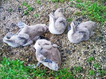 Keywords: mute swan signets cygnus olor swans waterfowl young grey plumage webbed feet stoney bank close-up
