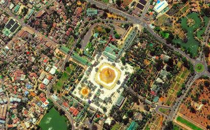 Keywords: architecture asia bâtiment birman birmanie buddhist burma golden myanmar pagodas rangoon rangoun shwedagon sky stupa temple www.wbayer.com wwwwbayercom La pagode est située à 2 km du centre ville de Yangon, au n°1, Shwedagon Pagoda Road. Elle repose sur une plate-forme pavée de marbre de 5,6 hectares, au sommet de la colline de Singuttara, à 51 m au-dessus de la ville. Elle domine l'horizon. On y accède par des escaliers et des ascenseurs situés aux quatre points cardinaux. Deux chinthes (lions mythiques) monumentaux gardent l'entrée sud ; ils ont été offerts par roi Tharrawaddy lors de sa visite en 18418. La pagode principale se trouve au milieu d'un vaste complexe de 72 autres pagodes, pagodons, salles de prières, tazaungs, pyatthats9 et autres édifices religieux à l'architecture typiquement birmane, ainsi que de très nombreuses statues de bouddhas et de nats. Le stûpa atteint la hauteur de 98 mètres. Sa base est faite de briques recouvertes de milliers de plaques d'or. Elle est entourée d'une forêt de 64 petits pagodons10 qui forment une petite enceinte avec 4 temples plus grands situés aux points cardinaux. Sur la flèche se trouve une sorte d'ombrelle, appelée le hti en birman où sont accrochées 1065 clochettes d'or et 420 clochettes d'argent11, ainsi qu'une girouette ornée de pierres précieuses. Elle se termine par le seinbu, une petite sphère d'or incrustée de milliers de diamants12 dont une émeraude13 de 76 carats. La pagode est située à 2 km du centre ville de Yangon, au n°1, Shwedagon Pagoda Road. Elle repose sur une plate-forme pavée de marbre de 5,6 hectares, au sommet de la colline de Singuttara, à 51 m au-dessus de la ville. Elle domine l'horizon. On y accède par des escaliers et des ascenseurs situés aux quatre points cardinaux. Deux chinthes (lions mythiques) monumentaux gardent l'entrée sud ; ils ont été offerts par roi Tharrawaddy lors de sa visite en 18418. La pagode principale se trouve au milieu d'un vaste complexe de 72 autres pagodes, pagodons, salles de prières, tazaungs, pyatthats9 et autres édifices religieux à l'architecture typiquement birmane, ainsi que de très nombreuses statues de bouddhas et de nats. Le stûpa atteint la hauteur de 98 mètres. Sa base est faite de briques recouvertes de milliers de plaques d'or. Elle est entourée d'une forêt de 64 petits pagodons10 qui forment une petite enceinte avec 4 temples plus grands situés aux points cardinaux. Sur la flèche se trouve une sorte d'ombrelle, appelée le hti en birman où sont accrochées 1065 clochettes d'or et 420 clochettes d'argent11, ainsi qu'une girouette ornée de pierres précieuses. Elle se termine par le seinbu, une petite sphère d'or incrustée de milliers de diamants12 dont une émeraude13 de 76 carats.