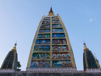 | Keywords: architecture asia bâtiment birman birmanie buddhist burma golden myanmar pagodas rangoon rangoun shwedagon sky stupa temple www.wbayer.com wwwwbayercom building outdoor skyscraper tower La pagode est située à 2 km du centre ville de Yangon, au n°1, Shwedagon Pagoda Road. Elle repose sur une plate-forme pavée de marbre de 5,6 hectares, au sommet de la colline de Singuttara, à 51 m au-dessus de la ville. Elle domine l'horizon. On y accède par des escaliers et des ascenseurs situés aux quatre points cardinaux. Deux chinthes (lions mythiques) monumentaux gardent l'entrée sud ; ils ont été offerts par roi Tharrawaddy lors de sa visite en 18418. La pagode principale se trouve au milieu d'un vaste complexe de 72 autres pagodes, pagodons, salles de prières, tazaungs, pyatthats9 et autres édifices religieux à l'architecture typiquement birmane, ainsi que de très nombreuses statues de bouddhas et de nats. Le stûpa atteint la hauteur de 98 mètres. Sa base est faite de briques recouvertes de milliers de plaques d'or. Elle est entourée d'une forêt de 64 petits pagodons10 qui forment une petite enceinte avec 4 temples plus grands situés aux points cardinaux. Sur la flèche se trouve une sorte d'ombrelle, appelée le hti en birman où sont accrochées 1065 clochettes d'or et 420 clochettes d'argent11, ainsi qu'une girouette ornée de pierres précieuses. Elle se termine par le seinbu, une petite sphère d'or incrustée de milliers de diamants12 dont une émeraude13 de 76 carats. La pagode est située à 2 km du centre ville de Yangon, au n°1, Shwedagon Pagoda Road. Elle repose sur une plate-forme pavée de marbre de 5,6 hectares, au sommet de la colline de Singuttara, à 51 m au-dessus de la ville. Elle domine l'horizon. On y accède par des escaliers et des ascenseurs situés aux quatre points cardinaux. Deux chinthes (lions mythiques) monumentaux gardent l'entrée sud ; ils ont été offerts par roi Tharrawaddy lors de sa visite en 18418. La pagode principale se trouve au milieu d'un vaste complexe de 72 autres pagodes, pagodons, salles de prières, tazaungs, pyatthats9 et autres édifices religieux à l'architecture typiquement birmane, ainsi que de très nombreuses statues de bouddhas et de nats. Le stûpa atteint la hauteur de 98 mètres. Sa base est faite de briques recouvertes de milliers de plaques d'or. Elle est entourée d'une forêt de 64 petits pagodons10 qui forment une petite enceinte avec 4 temples plus grands situés aux points cardinaux. Sur la flèche se trouve une sorte d'ombrelle, appelée le hti en birman où sont accrochées 1065 clochettes d'or et 420 clochettes d'argent11, ainsi qu'une girouette ornée de pierres précieuses. Elle se termine par le seinbu, une petite sphère d'or incrustée de milliers de diamants12 dont une émeraude13 de 76 carats. |