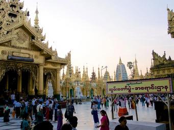 | Keywords: architecture asia bâtiment birman birmanie buddhist burma golden myanmar pagodas rangoon rangoun shwedagon sky stupa temple www.wbayer.com wwwwbayercom building outdoor road people crowd La pagode est située à 2 km du centre ville de Yangon, au n°1, Shwedagon Pagoda Road. Elle repose sur une plate-forme pavée de marbre de 5,6 hectares, au sommet de la colline de Singuttara, à 51 m au-dessus de la ville. Elle domine l'horizon. On y accède par des escaliers et des ascenseurs situés aux quatre points cardinaux. Deux chinthes (lions mythiques) monumentaux gardent l'entrée sud ; ils ont été offerts par roi Tharrawaddy lors de sa visite en 18418. La pagode principale se trouve au milieu d'un vaste complexe de 72 autres pagodes, pagodons, salles de prières, tazaungs, pyatthats9 et autres édifices religieux à l'architecture typiquement birmane, ainsi que de très nombreuses statues de bouddhas et de nats. Le stûpa atteint la hauteur de 98 mètres. Sa base est faite de briques recouvertes de milliers de plaques d'or. Elle est entourée d'une forêt de 64 petits pagodons10 qui forment une petite enceinte avec 4 temples plus grands situés aux points cardinaux. Sur la flèche se trouve une sorte d'ombrelle, appelée le hti en birman où sont accrochées 1065 clochettes d'or et 420 clochettes d'argent11, ainsi qu'une girouette ornée de pierres précieuses. Elle se termine par le seinbu, une petite sphère d'or incrustée de milliers de diamants12 dont une émeraude13 de 76 carats. La pagode est située à 2 km du centre ville de Yangon, au n°1, Shwedagon Pagoda Road. Elle repose sur une plate-forme pavée de marbre de 5,6 hectares, au sommet de la colline de Singuttara, à 51 m au-dessus de la ville. Elle domine l'horizon. On y accède par des escaliers et des ascenseurs situés aux quatre points cardinaux. Deux chinthes (lions mythiques) monumentaux gardent l'entrée sud ; ils ont été offerts par roi Tharrawaddy lors de sa visite en 18418. La pagode principale se trouve au milieu d'un vaste complexe de 72 autres pagodes, pagodons, salles de prières, tazaungs, pyatthats9 et autres édifices religieux à l'architecture typiquement birmane, ainsi que de très nombreuses statues de bouddhas et de nats. Le stûpa atteint la hauteur de 98 mètres. Sa base est faite de briques recouvertes de milliers de plaques d'or. Elle est entourée d'une forêt de 64 petits pagodons10 qui forment une petite enceinte avec 4 temples plus grands situés aux points cardinaux. Sur la flèche se trouve une sorte d'ombrelle, appelée le hti en birman où sont accrochées 1065 clochettes d'or et 420 clochettes d'argent11, ainsi qu'une girouette ornée de pierres précieuses. Elle se termine par le seinbu, une petite sphère d'or incrustée de milliers de diamants12 dont une émeraude13 de 76 carats. |