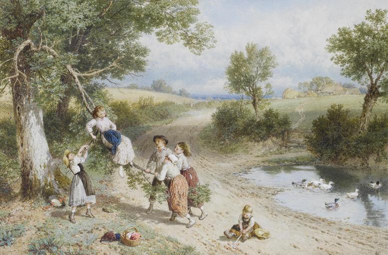 | Keywords: Myles Birket Foster The Swing.jpg The Swing Signed with monogram Watercolour heightened with bodycolour 27 5 x 41 5 cm http //www bonhams com/ Bonhams by 1899 Myles Birket Foster 1825 “1899 PD-old-70 Images from Bonhams Myles Birket Foster Watercolor paintings of people Swings in art Playing children in art |