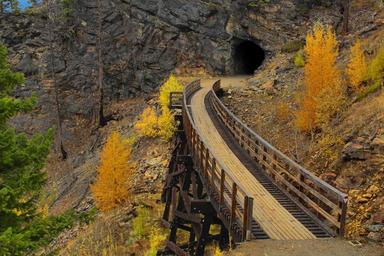 Keywords: myracanyon trestle bridge tunnel park fall autumn kelowna okanagan bc britishcolumbia canada historical rock mountain kvr kettlevalleyrailway