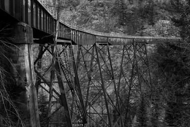 Keywords: blackandwhite black white bw monochrome myracanyon trestle 6 six kelowna okanagan bc britishcolumbia canada structure steal engineering fall contrasts huge large big massive park trail railway bridge high tall kvr kettle valley