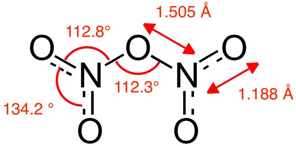 | Keywords: N2O5 from McClelland et al 2001.png Structure with bond lengths and angles of the dinitrogen pentoxide molecule N<sub>2</sub>O<sub>5</sub> as found in the gas phase Structural information determined by gas-phase electron diffraction and computational modelling from B M McClelland A D Richardson K Hedberg A Reinvestigation of the Structure and Torsional Potential of N<sub>2</sub>O<sub>5</sub> by Gas-Phase Electron Diffraction Augmented by Ab Initio Theoretical Calculations Helv Chim Acta 2001 84 1612-1624 Own 2014-06-03 Ben Mills Benjah-bmm27 Images by Ben Mills Dinitrogen pentoxide |