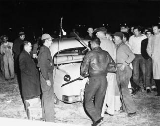 | Keywords: ku klux klan kukluxklan robeson county robesoncounty lumbee indians lumbeeindians blackandwhite monochrome black and white White men and Robeson County indians (Lumbee Indians) in crowd with a car and guns (State's Exhibit No.5). Photo taken by Bill Shaw, Fayetteville Observer newspaper photographer. Photo used as state's evidence in North Carolina Supreme Court Case Number 722, State vs James Garland Martin, Spring Term 1959, and Case Number 723, State vs James Cole, James Garland Martin and others to the State unknown by name, Spring Term 1959. From General Negative Collection, State Archives of North Carolina. White men and Robeson County indians (Lumbee Indians) in crowd with a car and guns (State's Exhibit No.5). Photo taken by Bill Shaw, Fayetteville Observer newspaper photographer. Photo used as state's evidence in North Carolina Supreme Court Case Number 722, State vs James Garland Martin, Spring Term 1959, and Case Number 723, State vs James Cole, James Garland Martin and others to the State unknown by name, Spring Term 1959. From General Negative Collection, State Archives of North Carolina. |