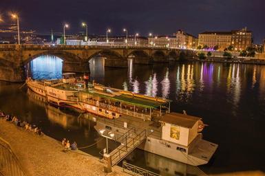 Keywords: náplavka night lod prague river water city bridge flowing