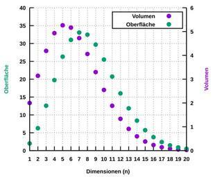 | Keywords: N-dimensionale einheitskugel surf-vol.svg de Oberfläche und Volumen der n-Dimensionalen Einheitskugel v gnuplot cvs reset set terminal svg fname 'Arial bold' fsize 15 lw 2 set border 11 set key box set xrange 1 20 set yrange 0 40 set sample 20 set tics nomirror set xtics 1 set y2tics 1 set xlabel 'Dimensionen n ' set ylabel 'Oberfläche' tc lt 2 set y2label 'Volumen' tc lt 1 set grid set output 'sphere svg' plot pi x/2 / gamma 1 + x/2 w p pt 7 t 'Volumen' axes x1y2 \ 2 pi x/2 / gamma x/2 w p pt 7 t 'Oberfläche' unset output 2014-07-31 15 46 13 own StefanPohl cc-zero Uploaded with UploadWizard Check categories 2015 July 4 Spheres |