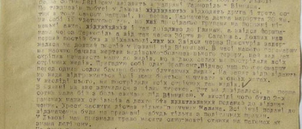 | Keywords: Nachtigall Battalion report about extermination of Jews in Vinnytsia, Ukraine, in July–August 1941.jpg A report by a member of the w Nachtigall Battalion about the activities of the unit in July August 1941 that is the extermination of Jews in the Vinnytsia Oblast Ukraine The text of the report in Ukrainian language Ukrainian reads as follows Пе ша сотня Легіону заїздить у нап ямі Та нопіль- Вінниця По тиждневім побуті у Львові відходить д уга і т етя в тому самому нап ямі що пе ша П изначена денна ма ш ута 30 км и собі її улегшуємо тим що посідаємо г упами на по ожні німецькі авта і там доїздимо до Глинак а звідси фо шпанами че ез Те нопіль а від так че ез Зб уч до Саганів с Довшах наш пе ший постій був у іхальполі Звідси че ез П оску ів заде жалися на довший постій в Юзвіні під Вінницею В часі нашого пе ма шу ми наочно бачили же тви жидівсько-большовицького те о у цей вид теж ск іпив ненависть нашу до жидів що в двох селах ми пост іляли всіх ст ічних жидів П игадую собі один ф агмент Під час нашого пе ма шу пе ед одним селом бачили багато блукаючих людей а запит відповідають що жиди відг ожуються їм і вони бояться ночувать у своїх хатах У висліді цього ми пост іляли всіх ст ічних там жидів В Юзвіні ми вже злучилися з цілим ку енем Тут ми довідалися що пе ша сотня мала бій з більшовиками під Вінницею У висліді чого було 3-х анених наших ст ільців а дехто був поданий до відзначення Х ест заслуги дістав тільки по учик Калина Всі інші подані до відзначення були не п изнані мабудь тільки з політичних п ичин У Львові нам п изнали п аво носити синьо-жовті стяжки на погонах як знамя легіону Цент альний де жавний а хів вищих о ганів влади та уп авління Ук аїни ЦДАВО Ф 3833 Оп 1 Сп 157- Л 7 Ukrainian nationalist Stepan Bandera 's Organization of Ukrainian Nationalists OUN-B Sluzhba_Bezpeky security service 1944 PD-Ukraine cc-by-sa-3 0 GFDL Bandera's OUN Ukrainian Legion The Holocaust in Ukraine |