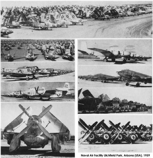 | Keywords: NAF Litchfield Park aircraft storage views 1959.jpg  Several views showing stored aircraft at the U S Navy Naval Air Facility Litchfield Park Arizona USA Visilbe are clockwise from the top Grumman F9F Panther and F9F/F-9 Cougar; Douglas JD-1 Invader; Douglas R4D/C-47 Skytrain Douglas AD/A-1 Skyraider; piston engines and propellers; a airborne early warning Skyraider; North American AJ-2 Savage; North American SNJ Texan; and Grumman F9F Panther and F9F/F-9 Cougar U S Navy Naval Aviation News April 1959 http //www history navy mil/nan/backissues/1950s/1959/Apr59 pdf 1959 USN 33 25 25 N 112 22 28 W PD-USGov-Military-Navy Naval Air Facility Litchfield Park |