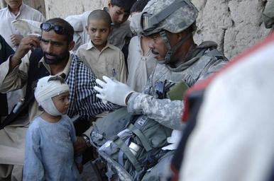 | Keywords: Nangarhar Provincial Reconstruction Team DVIDS127764.jpg en Air Force Tech Sgt William Allison 436th Medical Operation Squadron deployed from Dover Air Force Base Del provides medical aid to an Afghan child during a foot patrol Nov 8 2008 in Nangarhar province He is part of the Nangarhar Provincial Reconstruction Team The PRT is made up of Airmen and Soldiers from around the world and is charged with assisting the provincial government in improving security governance and reconstruction His hometown is Detroit Mich 2008-11-08 Capt J Elaine Hunnicutt https //www dvidshub net/image/127764 127764 2008-11-11 11 19 JALALABAD AF PD-USGov Dover Air Force Base Nangarhar Province Images from DoD uploaded by Fæ |