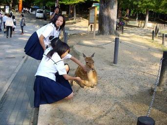 Keywords: Nara ciervo colegialas.JPG es Un ciervo en Nara Japón siendo acariciado por unas colegialas japonesas own すけ 2009-09-15 Tōdai-ji Schoolgirls of Japan Deer in Nara Cervus nippon centralis