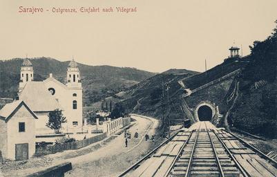 | Keywords: Narrow-Gauge-Railway Ostbahn Tunnel-No-6 Synagogue Visegrad.jpg en The synagogue and the western portal of the tunnel No 6 in Višegrad Old postcard Albert Thier Sarajevo 1910 43 46 53 5 N 19 17 24 E heading ENE Bosnian Eastern railway Postcards of Bosnia and Herzegovina Rail tunnels in Bosnia and Herzegovina Rail transport in Bosnia and Herzegovina in the 1900s Buildings in Višegrad PD-old-70-1923 | ||||