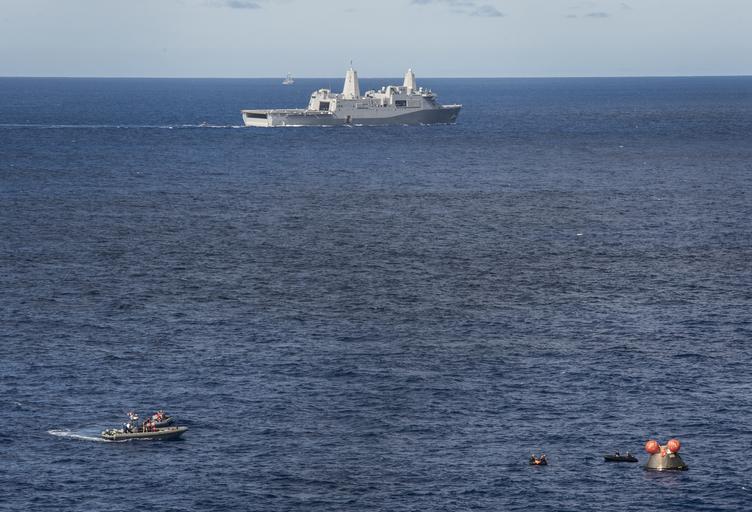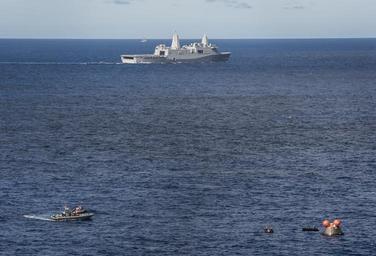 | Keywords: NASA Orion program 141205-N-GO855-804.jpg en Navy Divers assigned to Explosive Ordnance Disposal Mobile Unit 11 and Fleet Combat Camera Pacific attach a horse collar towing device to the NASA Orion Crew Module The amphibious transport dock USS Anchorage LPD 23 is currently conducting the first exploration test flight for the NASA Orion program EFT-1 is the fifth at sea testing of the Orion Crew Module using a Navy well deck recovery method U S Navy Photo by Mass Communication Specialist 1st Class Charles White/Released 2014-12-05 Petty Officer 2nd Class Charles White https //www dvidshub net/image/1689826 141205-N-GO855-804 2014-12-07 20 44 USS ANCHORAGE AT SEA PD-USGov-Military-Navy USS Anchorage LPD-23 Images from DoD uploaded by Fæ Orion spacecraft |