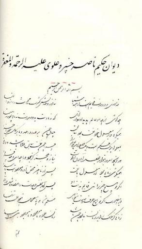 | Keywords: Nasir Khusraw's Divan (1).jpg Nasir Khusraw written in Shekasteh Nasta'liq style ناصر خسرو -- در حدود هشتهزار 8000 بيت شامل قصائد و غزليات و چند رباعى كه با نظم الفبا آخر ابيات آمده است آغاز «خداوندى كه در وحدت قديم است از همه اشيا نه اندر وحدتش كثرت نه محدث را از وانها چه گوئى از چه او عالم پديد آورد از اول كه نه مادت بدو صورت نه بالا بود و نه پهنا» انجام «آنچه نخواهى كه ندرويش مكار آنچه نخواهى كه بشويش مگوى» شکسته نستعلیق خوش، عبدالكريم گرگانى، جمادى الأول 1280، عناوين و نشان شنگرف، جلد تيماج زرشكى طلا كوب، لبه كتاب زرين، كتاب را ناسخ به دستور شاهزاده نواب عزّالدوله عبدالصمد ميرزا در زمانى كه در شميران بوده استنساخ شده و تحويل كتابخانه وى گرديده است مهر مربّع «عزّالدوله 1283» و بيضوى «عزّالدوله 1278 ظ » روى برگ اول ديده مى شود، برگهاى سفيد پيش و پس از كتاب وجود دارد 288 گ، 15 س، 13×20 سم ذريعه 9/1159 آقا نجفى 18/313 date http //library masoumeh com/8/index php id pn 138 Creator Nasir Khusraw PD-old-100 Nasir Khusraw Divan in Persian poetry Poems in Persian Shekasteh Nasta'liq Persian manuscripts |