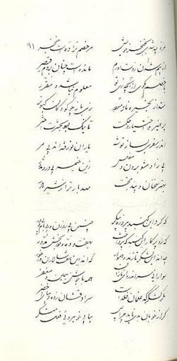 | Keywords: Nasir Khusraw's Divan (3).jpg Nasir Khusraw written in Shekasteh Nasta'liq style ناصر خسرو -- در حدود هشتهزار 8000 بيت شامل قصائد و غزليات و چند رباعى كه با نظم الفبا آخر ابيات آمده است آغاز «خداوندى كه در وحدت قديم است از همه اشيا نه اندر وحدتش كثرت نه محدث را از وانها چه گوئى از چه او عالم پديد آورد از اول كه نه مادت بدو صورت نه بالا بود و نه پهنا» انجام «آنچه نخواهى كه ندرويش مكار آنچه نخواهى كه بشويش مگوى» شکسته نستعلیق خوش، عبدالكريم گرگانى، جمادى الأول 1280، عناوين و نشان شنگرف، جلد تيماج زرشكى طلا كوب، لبه كتاب زرين، كتاب را ناسخ به دستور شاهزاده نواب عزّالدوله عبدالصمد ميرزا در زمانى كه در شميران بوده استنساخ شده و تحويل كتابخانه وى گرديده است مهر مربّع «عزّالدوله 1283» و بيضوى «عزّالدوله 1278 ظ » روى برگ اول ديده مى شود، برگهاى سفيد پيش و پس از كتاب وجود دارد 288 گ، 15 س، 13×20 سم ذريعه 9/1159 آقا نجفى 18/313 date http //library masoumeh com/8/index php id pn 138 Creator Nasir Khusraw PD-old-100 Nasir Khusraw Divan in Persian poetry Poems in Persian Shekasteh Nasta'liq Persian manuscripts |